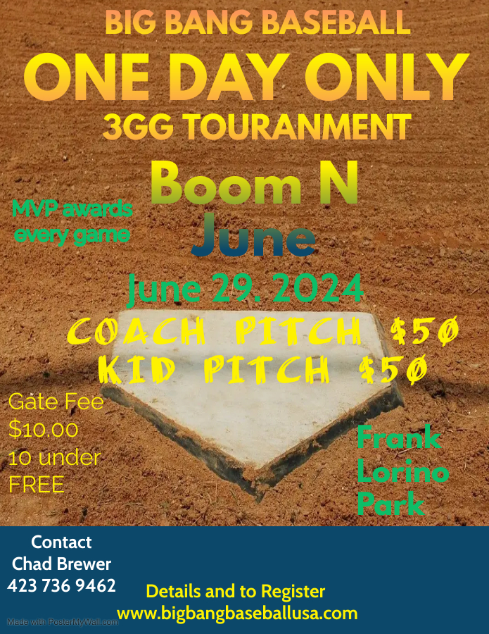COME CHECK OUT BIG BANG BASEBALL AND SEE WHAT WE HAVE TO OFFER, SEEDED 3GG FORMAT, SINGLE POOL SEEDED INTO DOUBLE ELIMINATION $50 TEAM ENTRY FEE FOR ALL AGE GROUPS POOL PLAY- 60 MIN FINISH BATTER BRACKET PLAY- 60 FINISH INNING GATE FEE 10 AND OLDER $10 CASH, CREDIT CARD, VENMO@ CHAD-BREWER-27